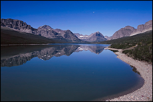Grinnell Point reflecting in Lake Sherburne in the Many Glacier Area vertical 082-1, Glacier National Park, Montana