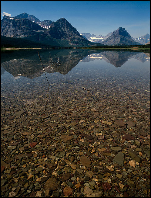 Grinnell Point reflecting in Lake Sherburne with pebbles in the Many Glacier Area vertical 093-1, Glacier National Park, Montana