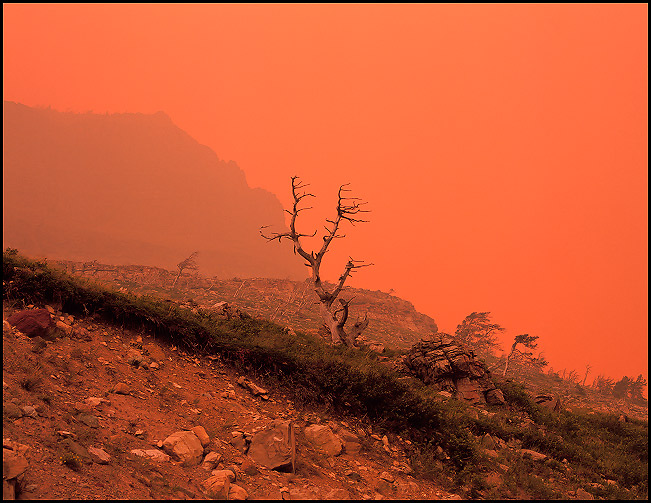 Orange sky from Trapper Creek forest fire, Glacier National Park, Montana, July